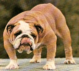 GENERAL APPEARANCE : Smooth-coated, thick set, rather low in stature, broad, powerful and compact. Head fairly large in proportion to size, but no point so much in excess of others as to destroy the general symmetry, or make the dog appear deformed, or interfere with its powers of motion. Face short, muzzle broad, blunt and inclined upwards. Dogs showing respiratory distress highly undesirable. Body short, well knit, with no tendency towards obesity. Limbs stout, well muscled and in hard condition. Hindquarters high and strong but somewhat lighter in comparison with heavy foreparts. Bitches not so grand or well-developed as dogs.